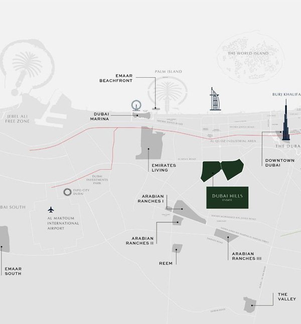 The master plan of Dubai Hills Estate integrates residential, commercial, and recreational zones within a vast green environment. The centerpiece, Dubai Hills Golf Course, is surrounded by upscale villas and apartments overlooking landscaped fairways. Key highlights include Dubai Hills Mall, community parks, schools, and wellness centers — all interconnected by pedestrian-friendly pathways. The plan prioritizes sustainability, open spaces, and connectivity, creating a self-contained lifestyle destination that harmoniously combines nature, luxury, and urban convenience.