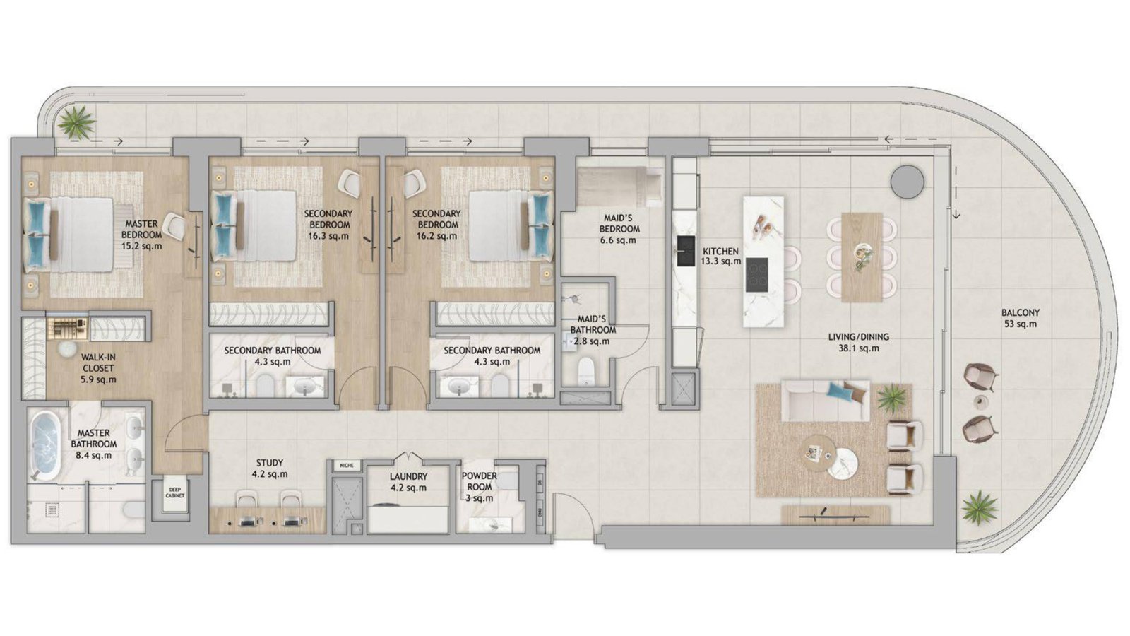This waterfront community on Fahid Island offers a resort-inspired lifestyle with a beachfront promenade, landscaped podium gardens, and a vibrant Waterfront Clubhouse. Wellness facilities include a gym with waterfront views, workout studio, assessment area, and a luxury spa with salt relaxation, cold plunge pools, sauna, steam, and private treatment rooms. Residents also enjoy a grab & go bar, residential lounge, co-working spaces, cinema, private dining, and dedicated kids’ and tween rooms. Outdoor amenities feature infinity swimming pools, volleyball and padel courts, family play areas, and green community spaces, all designed to balance relaxation, fitness, and leisure.
