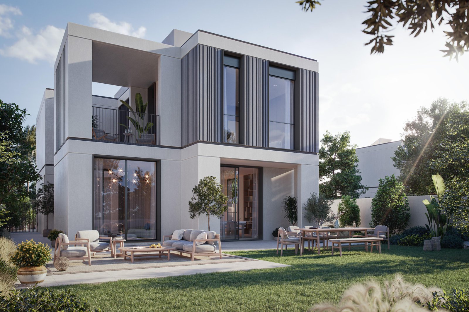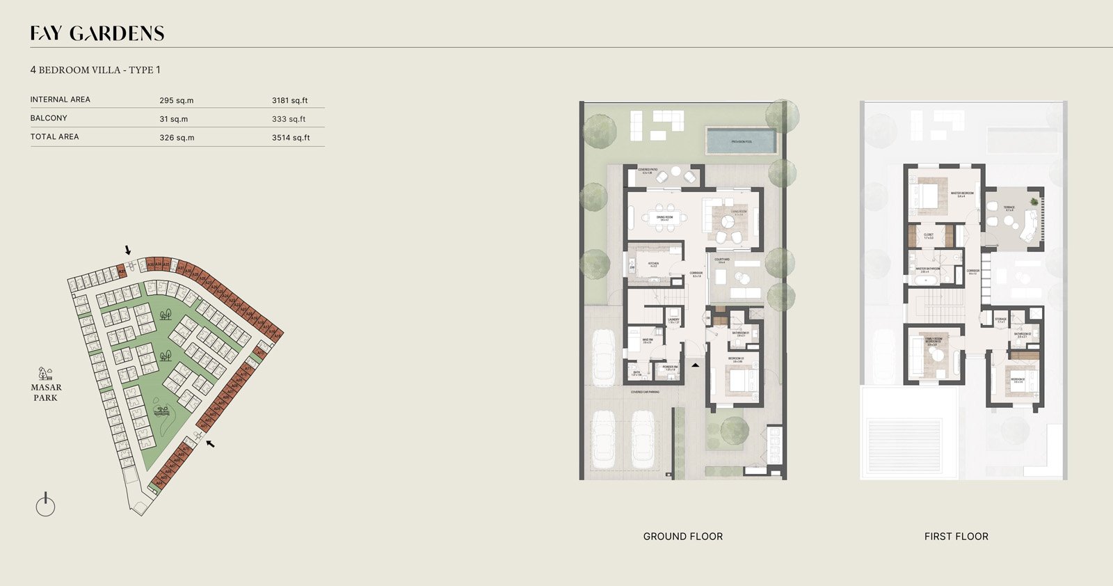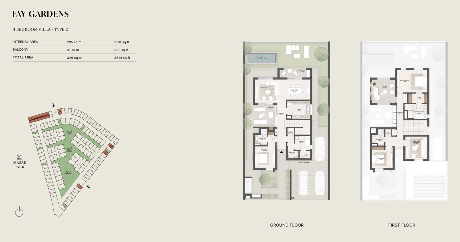 Property options include spacious four-bedroom villas starting at 3,469 sqft, elegant five-bedroom residences at 4,215 sqft, and grand six-bedroom villas reaching up to 5,176 sqft. Each home is crafted using sustainable materials and features open-plan layouts, generous majlis rooms, abundant natural light, and seamless indoor–outdoor transitions. Select units include private pools, maid’s rooms, driver’s rooms, and expansive terraces, delivering a lifestyle centered on privacy, comfort, and modern elegance.