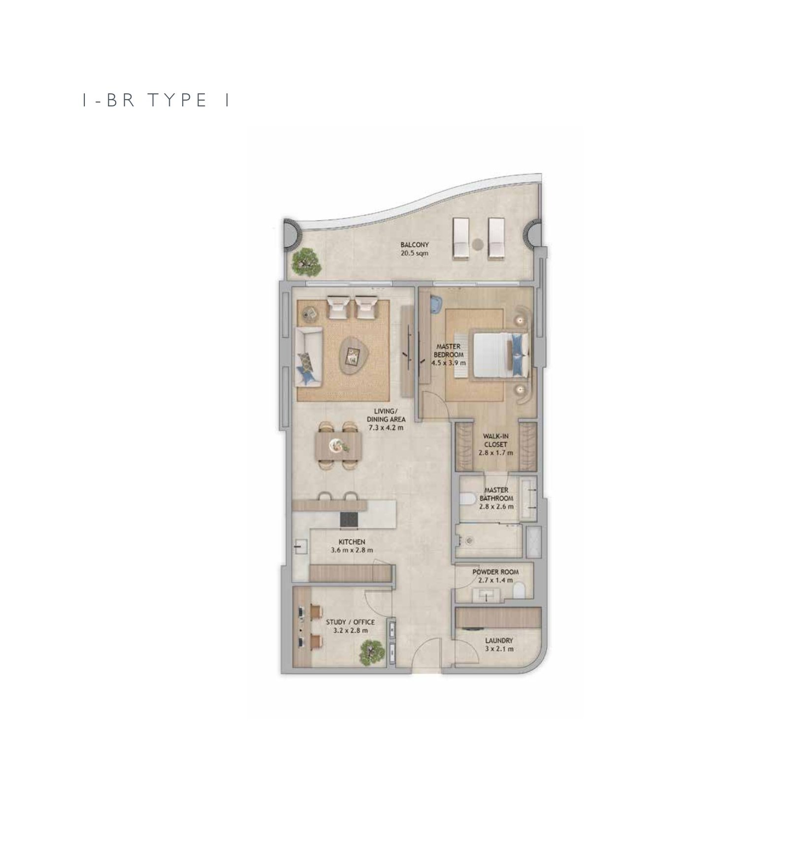 Developed by Aldar Properties, Mamsha Palm consists of a boutique collection of only 44 units. These comprise elegant 1-, 2- and 3-bedroom apartments, plus a few sky villas with four bedrooms. Situated in Saadiyat’s Cultural District, the design draws from biophilic principles: palm-tree form, shading, natural materials, and large windows to invite daylight and views.