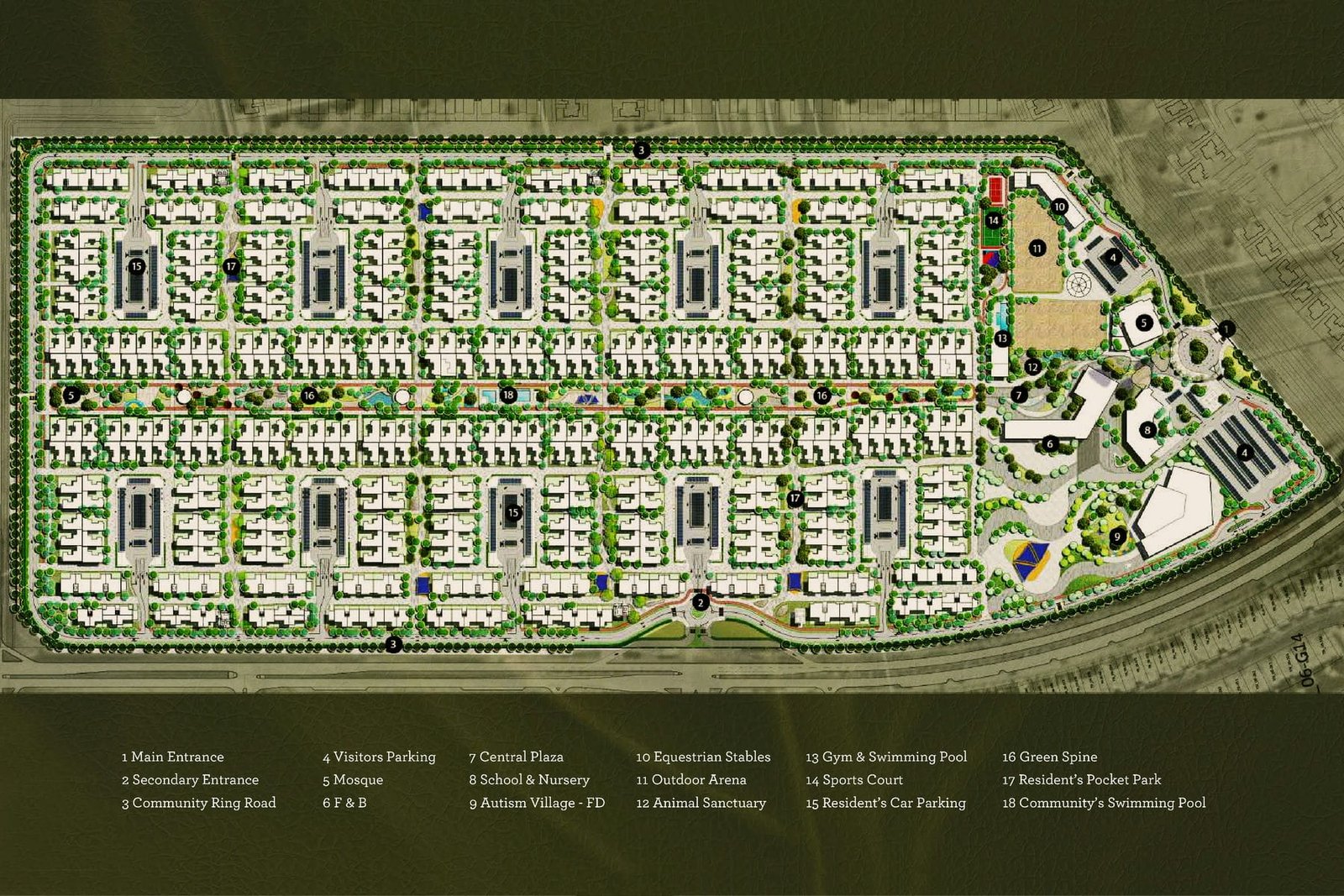 Clean Energy Powered: Solar panels power the majority of community needs, harnessing Abu Dhabi’s abundant sunshine.