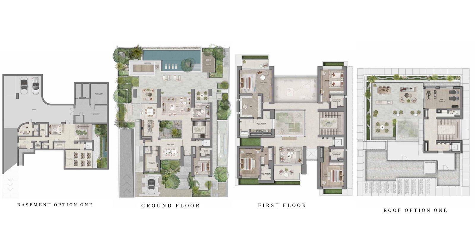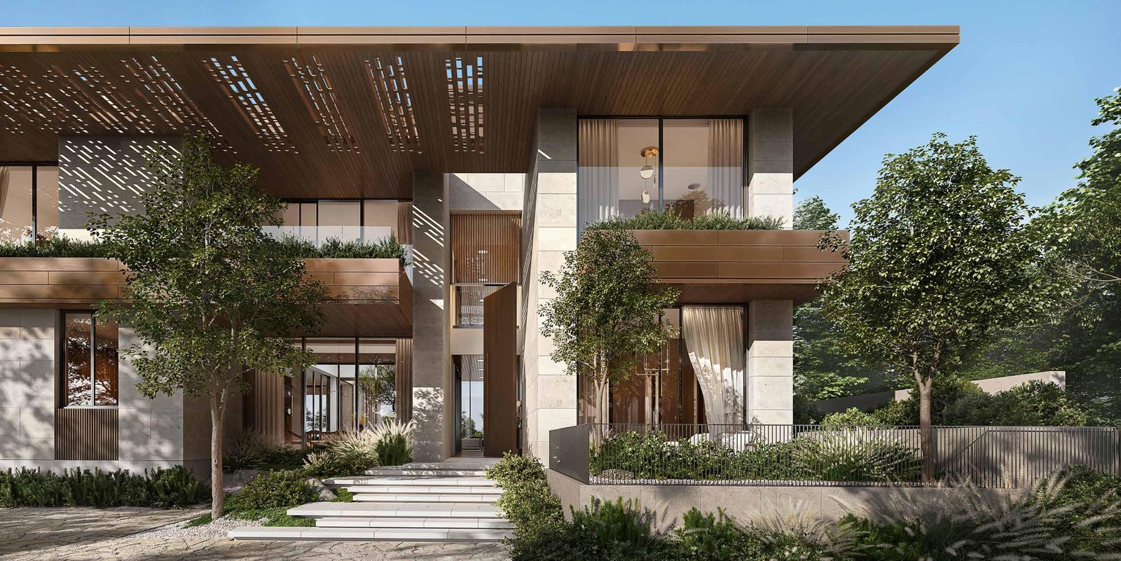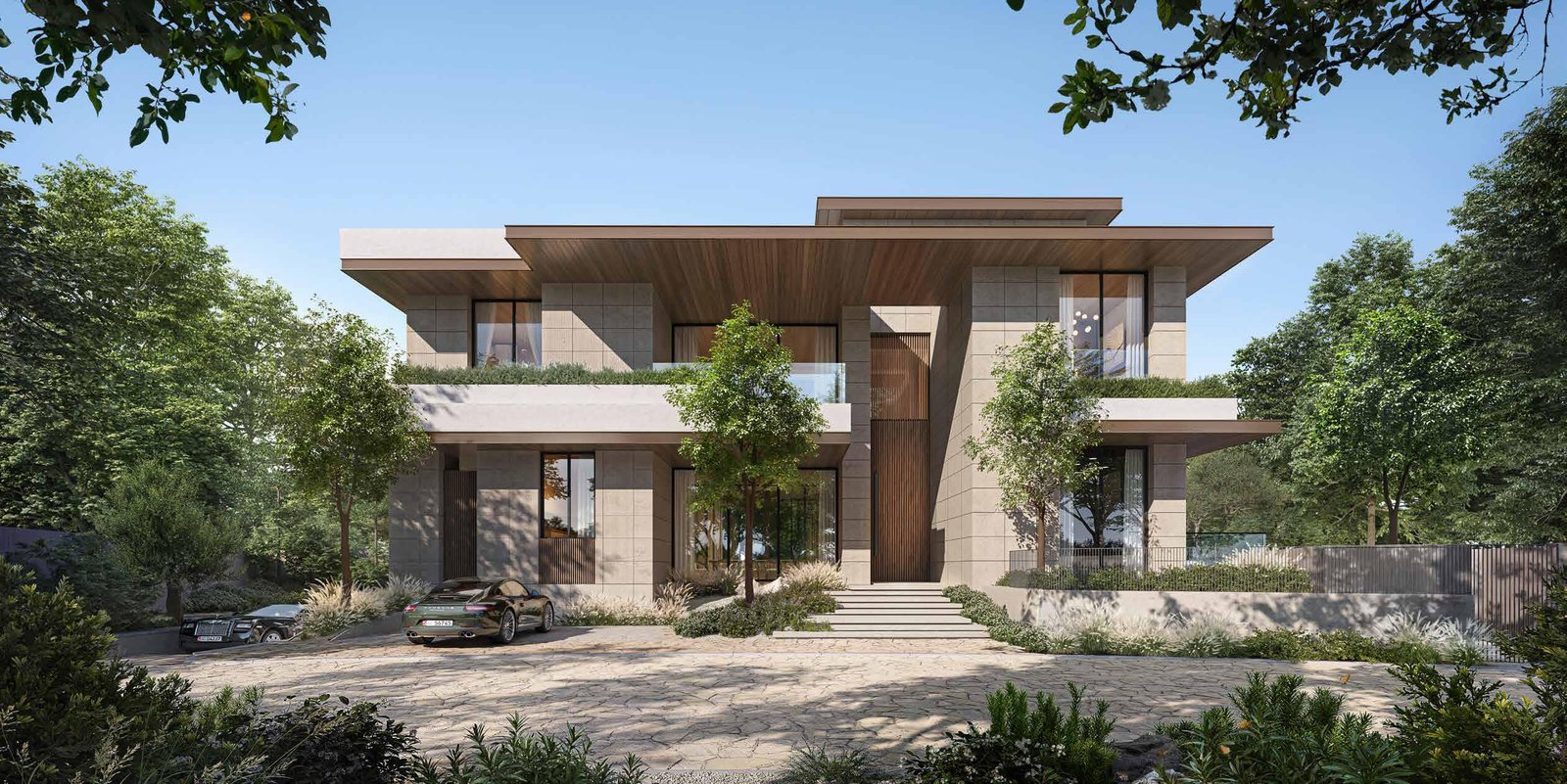 Moringa Mansions feature spacious 5 and 6 bedroom layouts complete with private gardens, central courtyards, rooftop terraces, and optional private pools. Each villa comes with private elevator access, a driver’s room, basement parking, and high-quality finishes, including engineered wood, porcelain tiles, and bespoke cabinetry. The façades are available in elegant combinations such as stone and copper or limestone with white render, complementing the lush surroundings. Generous living spaces maximize natural light and airflow, creating a calm and harmonious atmosphere.