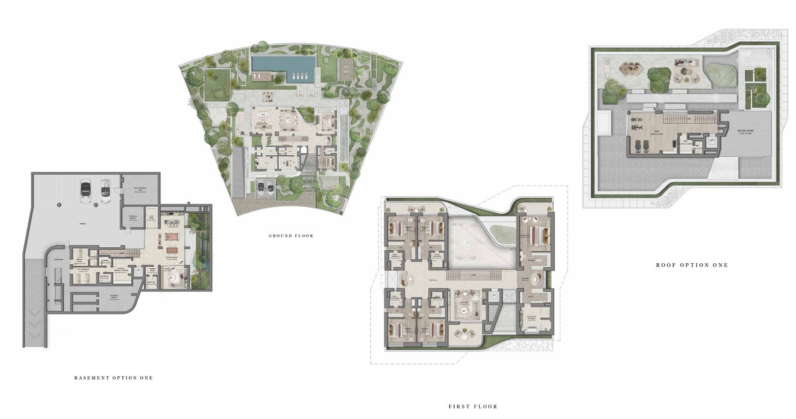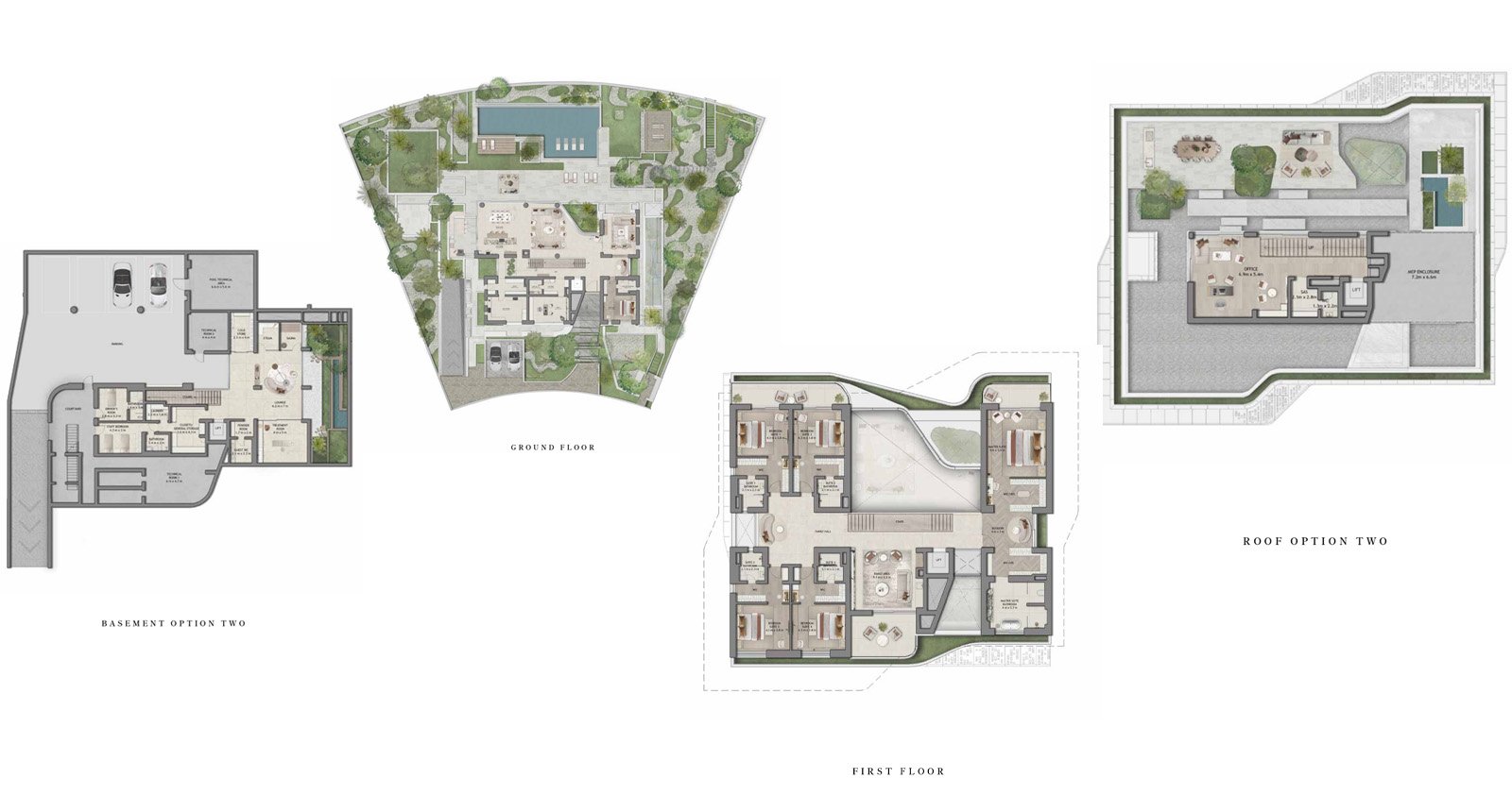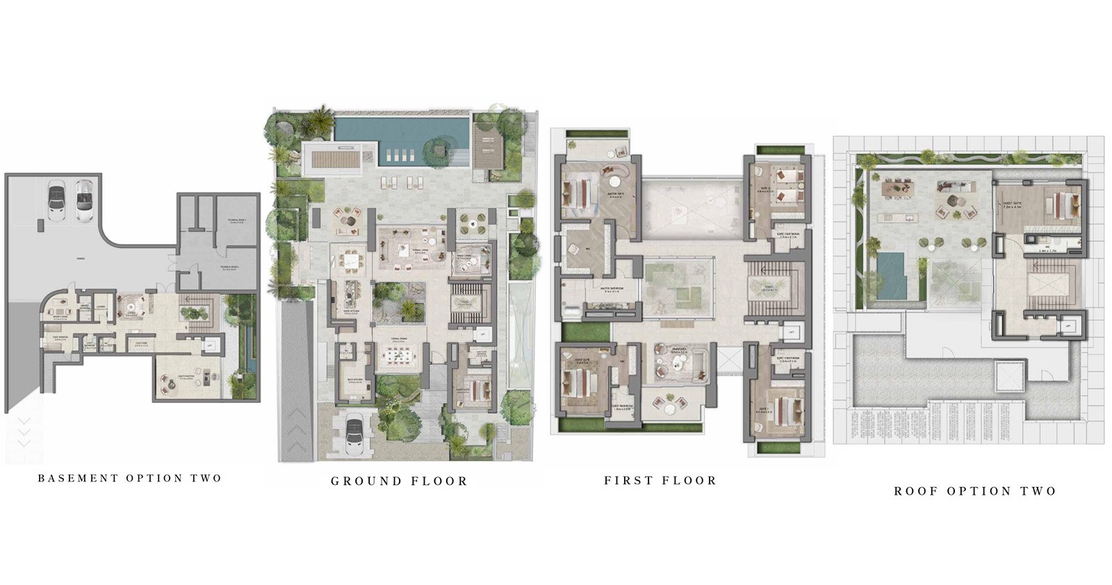 Moringa Mansions feature spacious 5 and 6 bedroom layouts complete with private gardens, central courtyards, rooftop terraces, and optional private pools. Each villa comes with private elevator access, a driver’s room, basement parking, and high-quality finishes, including engineered wood, porcelain tiles, and bespoke cabinetry. The façades are available in elegant combinations such as stone and copper or limestone with white render, complementing the lush surroundings. Generous living spaces maximize natural light and airflow, creating a calm and harmonious atmosphere.